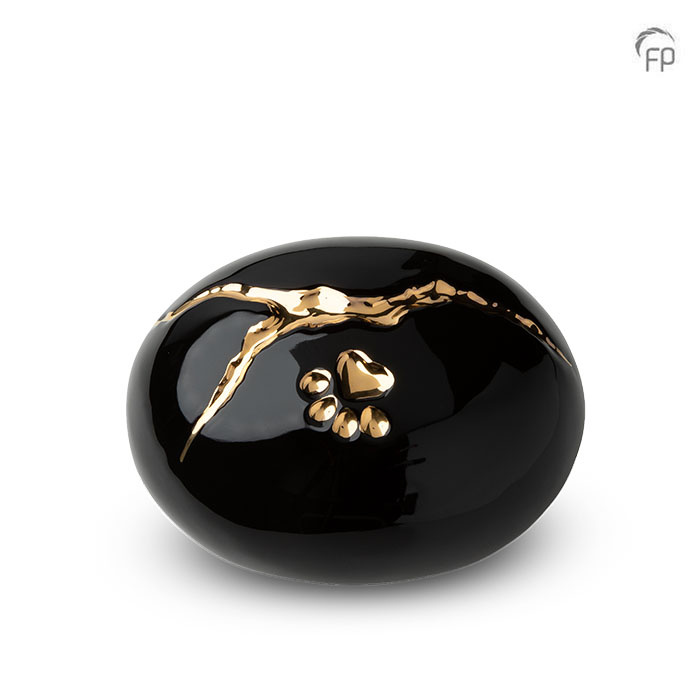Kintsugi betekent letterlijk ‘gouden verbinding’. In deze zwarte dierenurn komt de symboliek van herinneren tot uiting. Het unieke ontwerp, met zowel de kenmerkende goudkleurige scheuren als een subtiel afgebeelde goudkleurige dierenpoot, weerspiegelt de kunst van het helen en het waarderen van elke fase van het leven. De Kintsugi dierenurn is tevens verkrijgbaar in het wit.